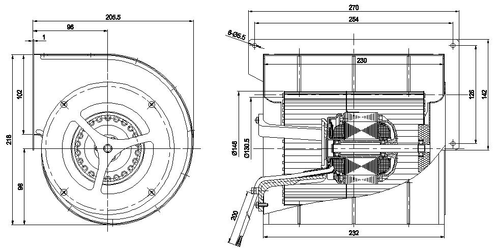 本風(fēng)機由直徑為φ92外轉(zhuǎn)子結(jié)構(gòu)的交流異步電動機,配以直徑為φ146金屬前彎葉輪和金屬噴漆蝸殼構(gòu)成一體,此系列風(fēng)機為兩邊進(jìn)風(fēng),俗稱雙進(jìn)風(fēng)風(fēng)機,具有結(jié)構(gòu)緊湊、體積小、重量輕、安裝方便等特點。該風(fēng)機具有較高的靜壓,廣泛用于變壓器散熱,也可以用在室內(nèi)管道除塵、排氣、空氣凈化等場合。